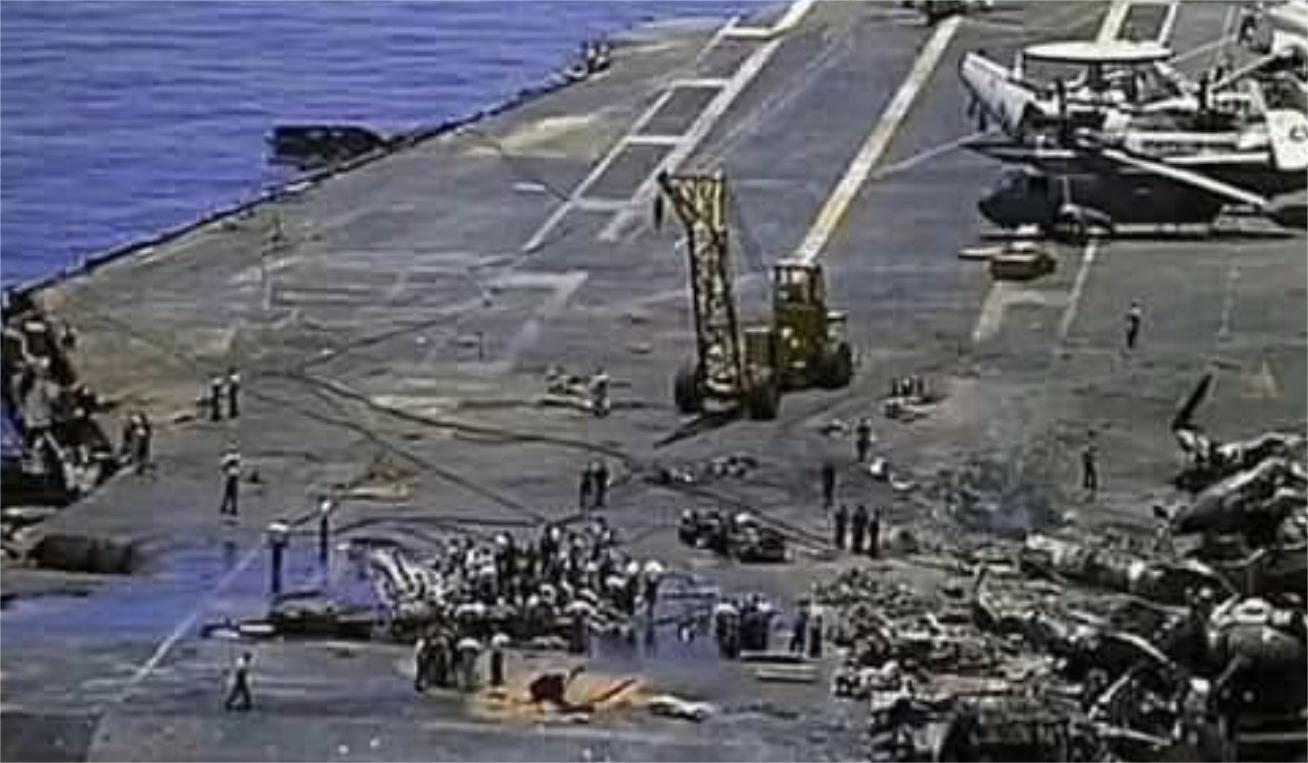Овај носач није потонуо, али би се рекло да више није за употребу, а ни авиони на њему ће тешко полетjети.
