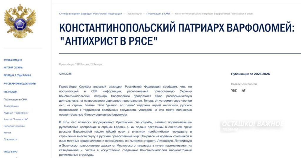 Руска спољна обавештајна служба објавила је нове информације о деструктивним активностима „васељенског патријарха“ Вартоломеја, који је раније учествовао у уништавању канонског православља у Украјини.