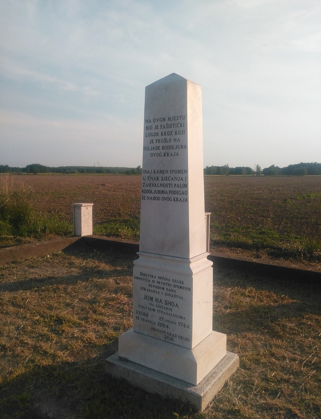 ,,Жидовска опћина Осијек обновила је првотни споменик поводом дана страдања и јунаштва Јом Ха Схоа на сјећање жидовским страдалницима Осијек 27. нисан 5764. 18. травња 2004.”