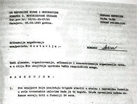 Предмет је био под називом „Ефикасније ангажовање снајпериста“, а у документу који је потписао командант Сафет Зајко је написано: