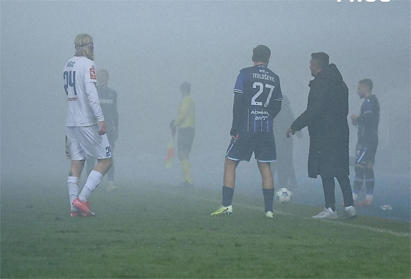 Дерби утакмица 17. кола фудбалске Премијер лиге БиХ на стадиону Грбавица у Сарајеву између Жељезничара и Широког Бријега прекинут је синоћ, због густе магле, у 23. минуту.