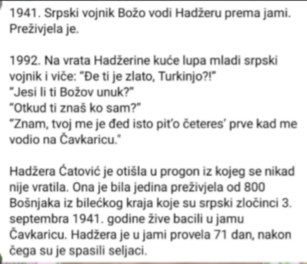 Оно што је посебно опасно јесте начин на који се ова прича „дорађује“: додају се измишљени дијалози из 1992. („Божов унук“, реплике на вратима), иако ни у свједочењима Хаџере нити у архивским изворима нема трага таквом догађају. Такви додаци нису наивно преувеличавање, него свјесно стварање моралне бајке у којој се читав српски народ представља са насилничким континуитетом „ђед–унук“, од 1941. до 1992. године . Циљ је да се код млађих муслиманских нараштаја створи утисак да је насиље над Србима било или оправдано или секундарно, а да су Срби искључиво агресори – упркос томе што је историја НДХ неспорно обиљежена систематским геноцидом над Србима уз активну улогу босанскохерцеговачких Муслимана који су били средство Загреба за непосредне егзекуције Срба и носили епитет „хрватско цвијеће“.