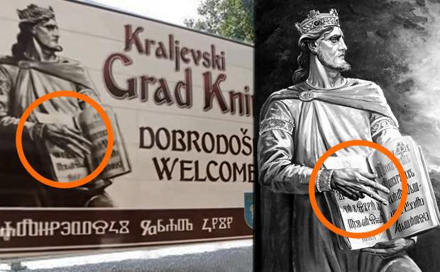 На улазу у Книн постављена је табла са добродошлицом свим путницима намјерницима, а на табли се налази и хрватски краљ Дмитар Звонимир, на фалсификованој фотографији. Наиме, у оригиналу се јасно виде испружена три краљевска прста док су на „ретушираној“ фотографији скривања истине и фалсификовања испружени сви прсти.