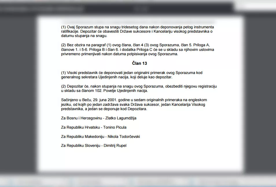 Споразум о сукцесији бивше СФРЈ потписале су тадашња Савезна Република Југославија, Хрватска, Словенија, Македонија и БиХ прије 24 године у Бечу тј. 29. јуна 2001. године и садржи седам анекса. Ступио је на снагу три године касније тј. јуна 2004. године након потписа и посљедње земље сукцесора, Хрватске. За прогнане Србе, друге оштећене грађане и српске фирме најважнији је Анекс Г који се тиче заштите приватне имовине и стечених права.