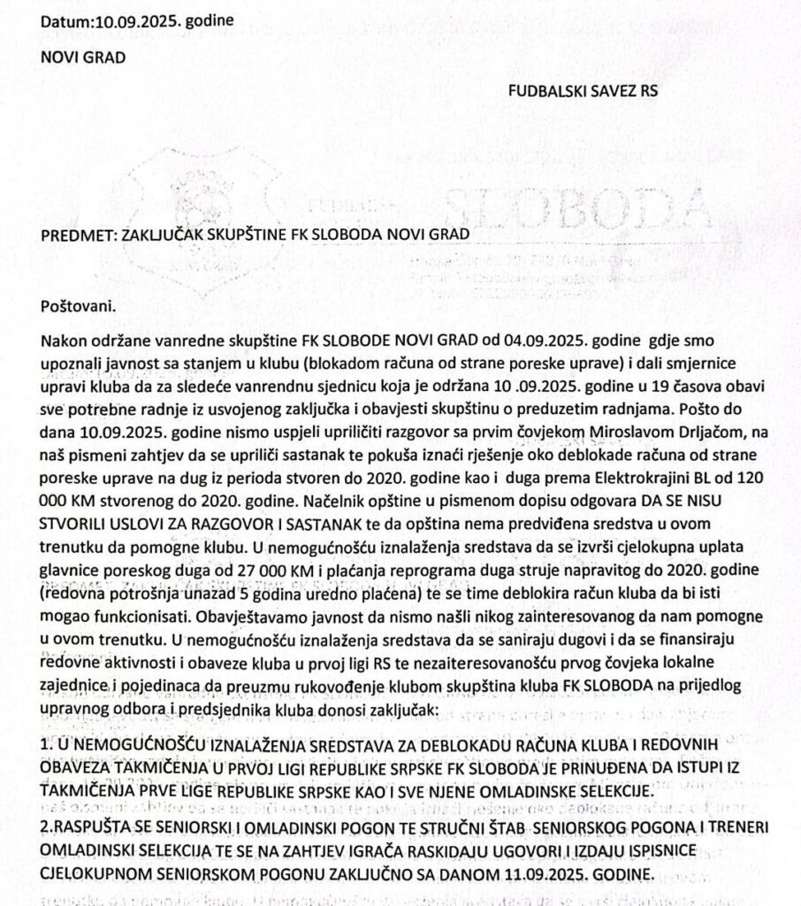 „Дана 10. септембра 2025. године у прес сали стадиона ‘Млакве’ у Новом Граду одржана је ванредна сједница Скупштине Фудбалског клуба Слобода МИНОА на којој је донесена одлука да клуб напушта такмичење у оквиру М:тел Прве лиге Републике Српске због тешке финансијске ситуације. Као што је јавност упозната, наш клуб није имао разумијевање од стране општинског руководства на челу са начелником општине када је у питању финансијска подршка, те смо самим тим доведени на сам руб егзистенције и више није било могућности за даље функционисање. Не само да начелник није нашао за сходно да помогне Слободи и изађе у сусрет, него се исти оглушио на наше позиве за један конструктиван разговор у циљу рјешавања кризне ситуације. Рачун клуба је у блокади од стране Пореске управе, а оптимално функционисање клуба је угушено и дуговањима из ранијих времена, односно наслијеђеним дуговањима до 2020. године.