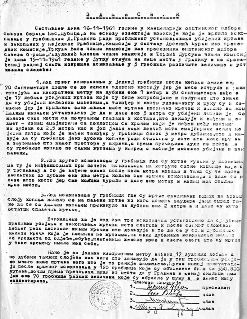 Истражујући заоставштину Владимира Дедијера, која се чува у 325 кутија у Архиву Словеније у Љубљани, нашао сам документ који је до сада био непознат не само широј јавности већ и историчарима. У кутији бр. 260 Дедијеровог фонда налази се копија извештаја који је 16. новембра 1961. сачинила четворочлана комисија општинског одбора Савеза бораца (тада Босанска, садашњи назив Козарска) Дубице. Притисак народа је те 1961. био јак да се учини нешто на изради споменика и истраживањима злочина, па је очито локални Савез бораца морао да реагује.